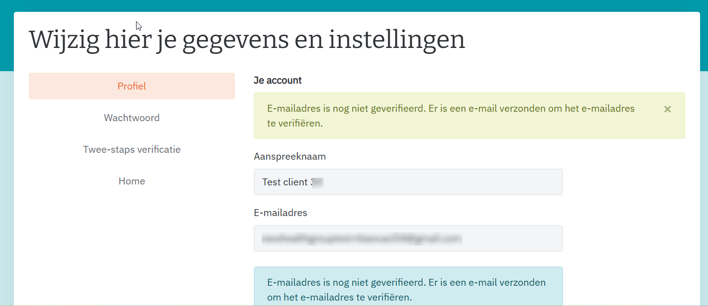 Na opslaan verschijnt een groene melding dat er een mail verzonden is naar het nieuwe mailadres. Dit nieuwe e-mailadres dient eerst geverifieerd te worden voordat je opnieuw kan inloggen.