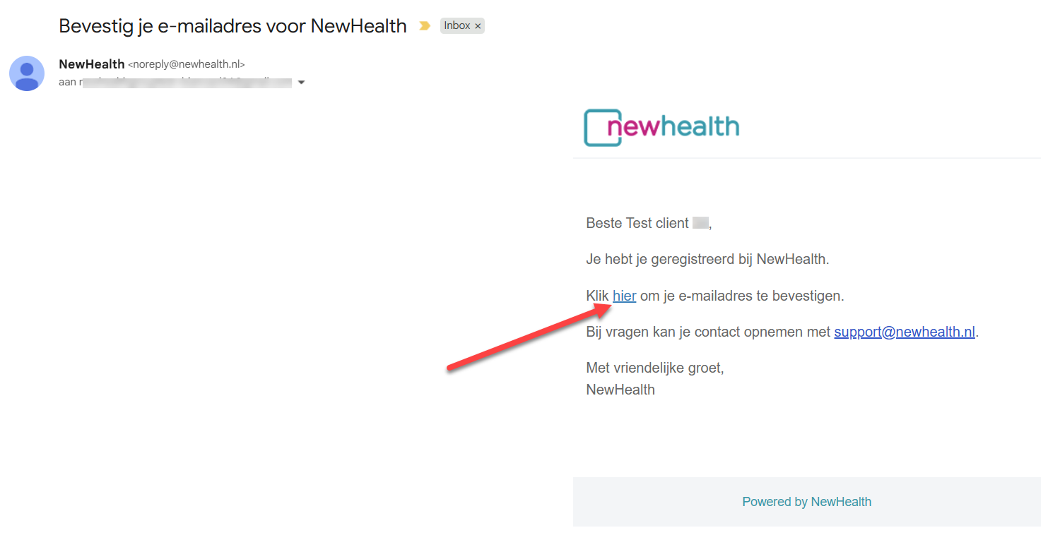 Ga naar je mailbox, open de mail 'Bevestig je e-mailadres voor NewHealth' en klik op de link ‘Klik hier om in je e-mailadres te bevestigen.