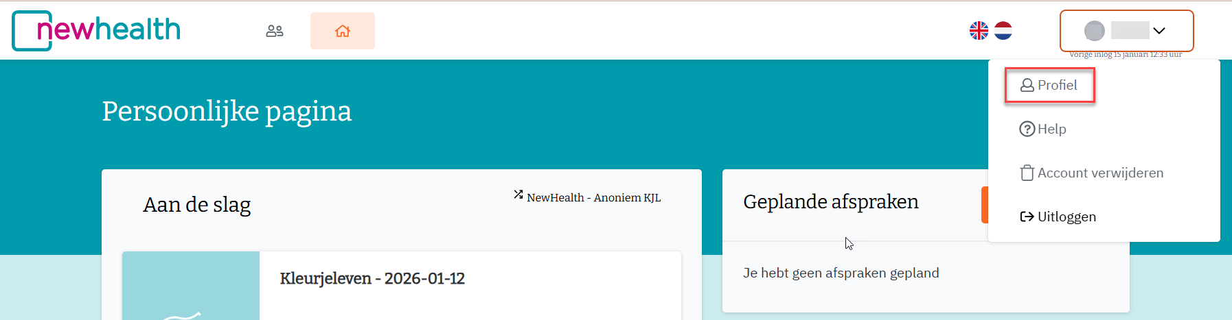 Als je bent ingelogd, klik je rechts bovenin op je naam en vervolgens op Profiel.