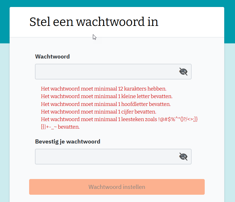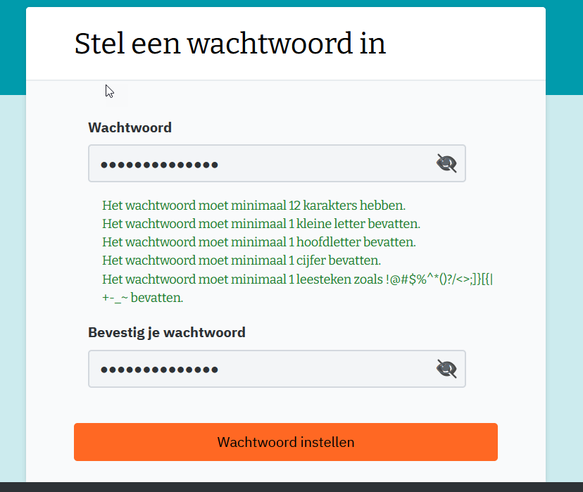 Als de teksten in groen getoond worden, dan is alles goed ingevuld en kan je klikken op de oranjeknop 'Wachtwoord instellen'.