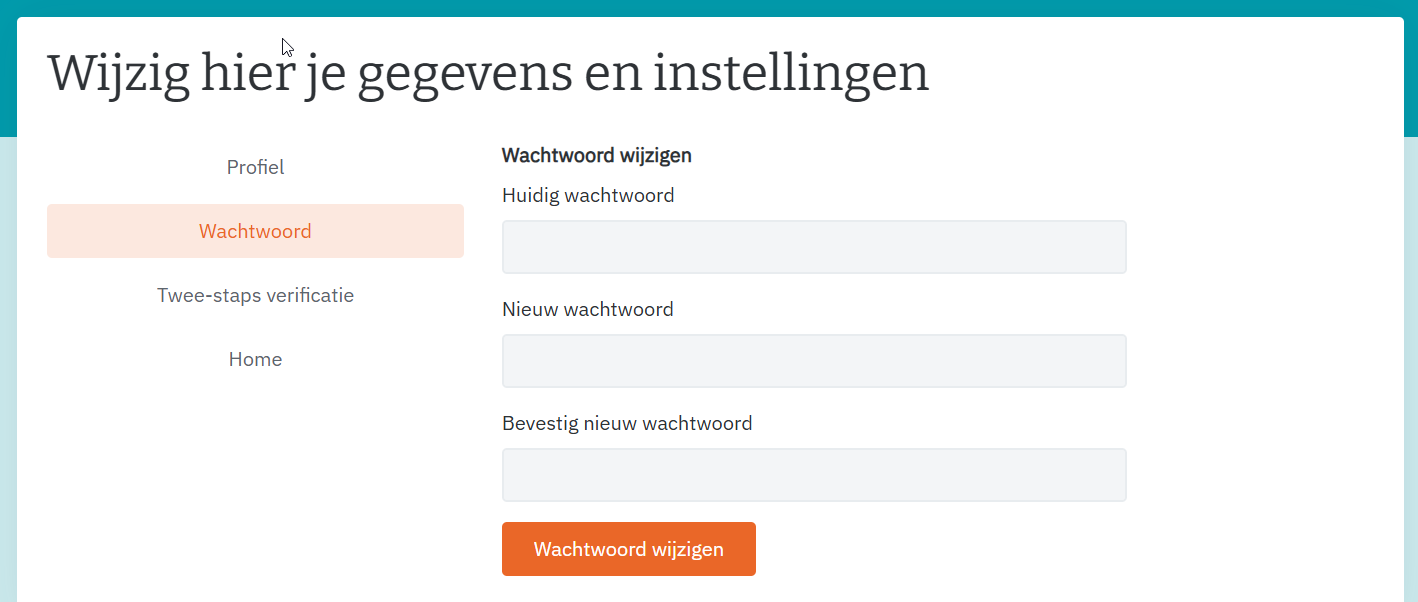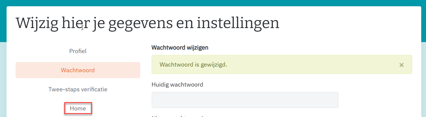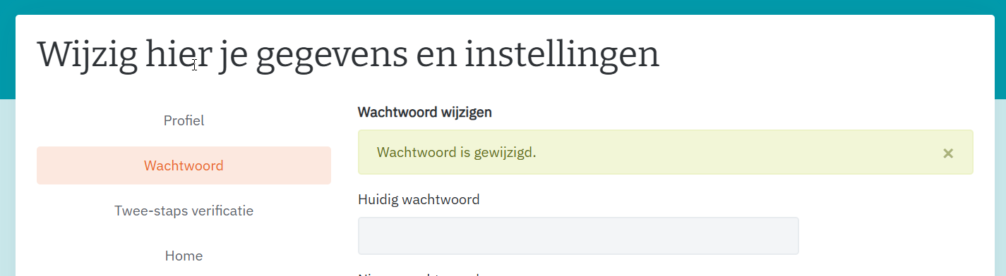 Voer eerst je huidige wachtwoord in, en 2x het nieuwe wachtwoord in. Klik daarna op 'Opslaan'. De groene melding bevestigt het wijzigen van je wachtwoord.