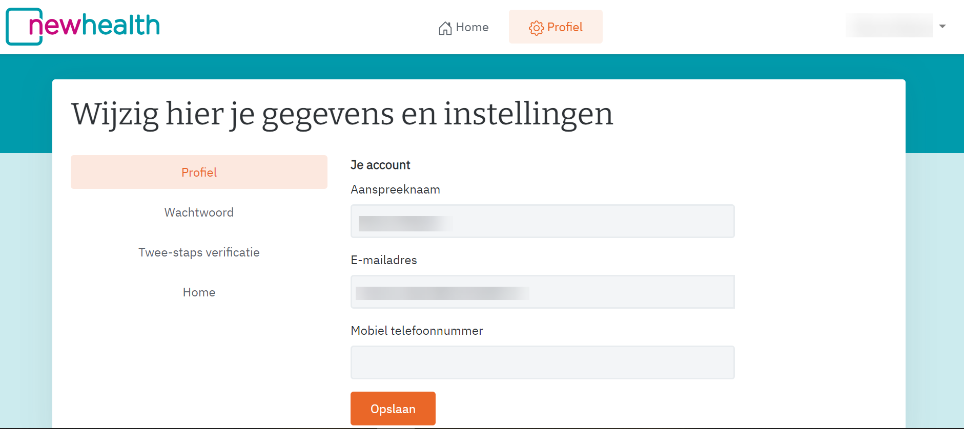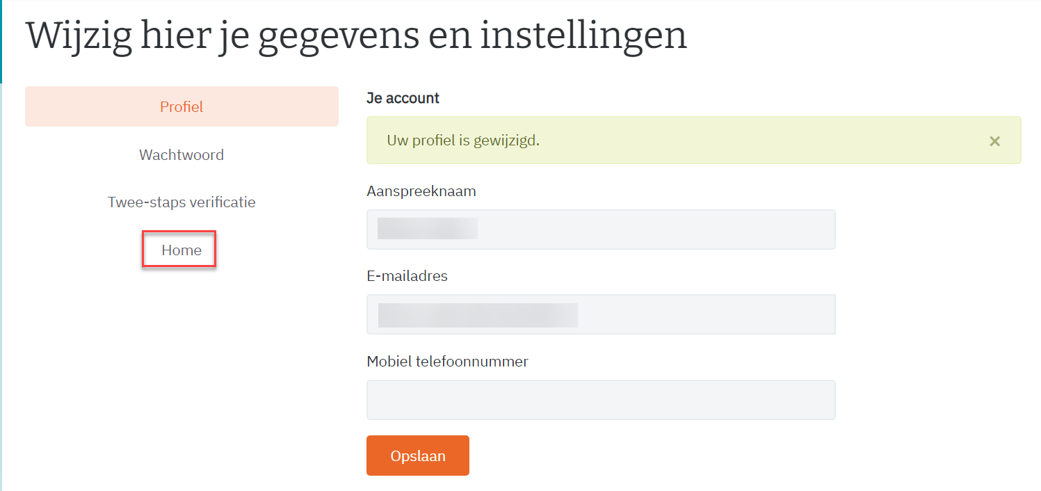 Via de knop 'Home' verlaat je het 'Profiel' en keer je terug naar de applicatie.