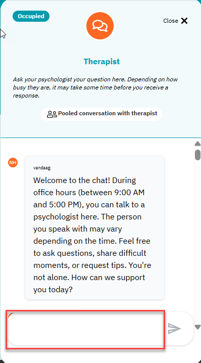 Our therapist are available via chat on working days during office hours (Monday to Friday from 9 a.m. to 5 p.m.). If you send a message, you will receive a response as soon as possible. Sometimes this may take a little longer due to high demand. You can also send a message outside office hours. One of our therapist will respond as soon as possible during office hours.