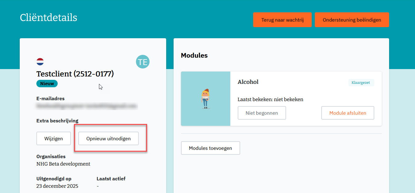 - de knop ‘Opnieuw uitnodigen’ is alleen zichtbaar zolang de cliënt de status heeft: ‘Niet begonnen’;