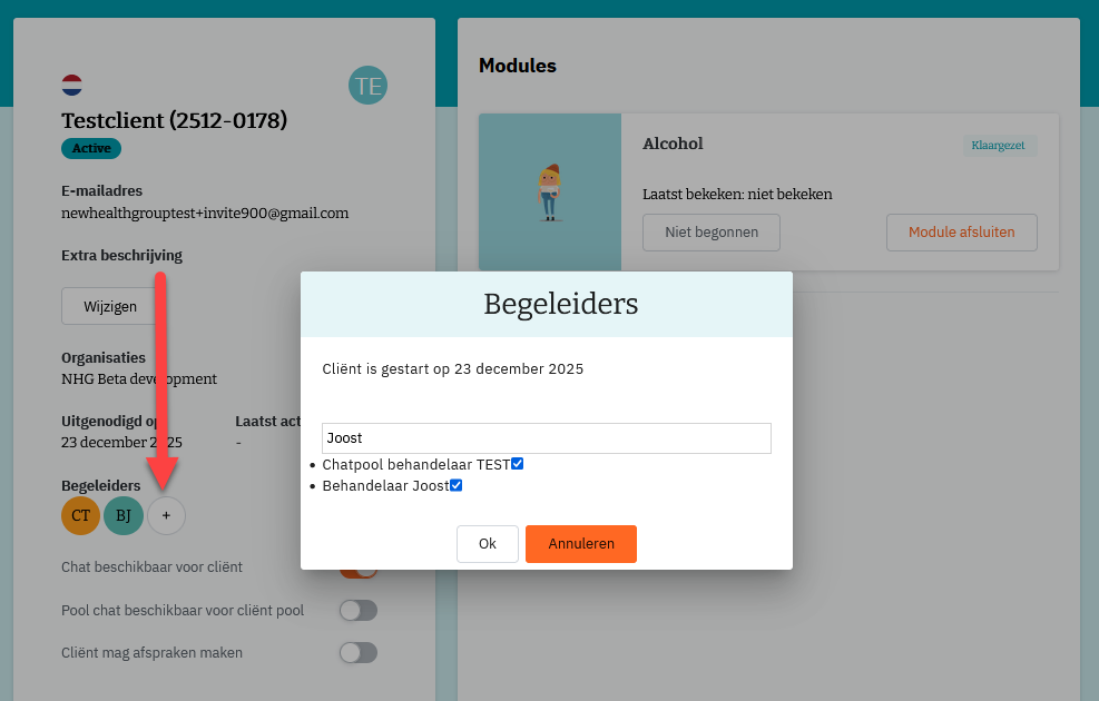 Open de cliënt-detailpagina en klik op het plus-bolletje bij 'Begeleiders’.