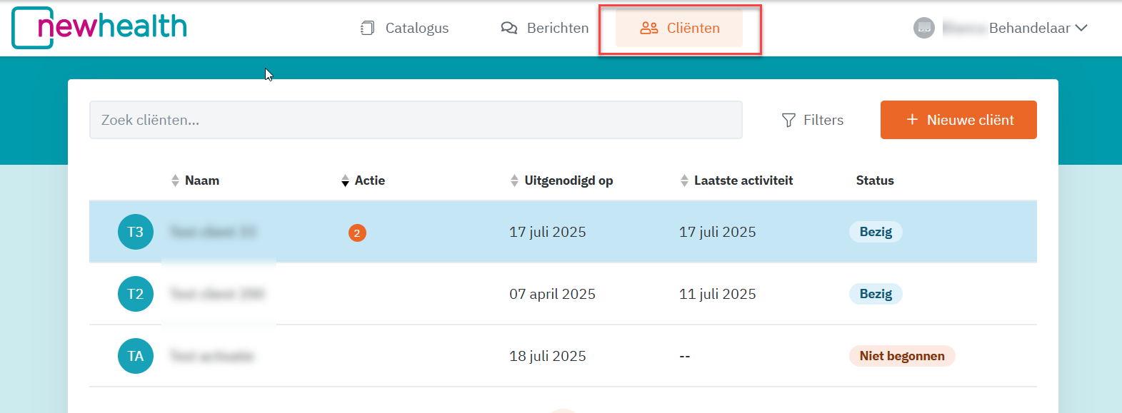 ‘Nog niet begonnen’ (uitnodigingsmail is verzonden, maar cliënt heeft zich nog niet geregistreerd; op de cliënt-detailpagina wordt vermeld ‘Traject is nog niet geactiveerd’); - 'Bezig’ (cliënt heeft zich geregistreerd);