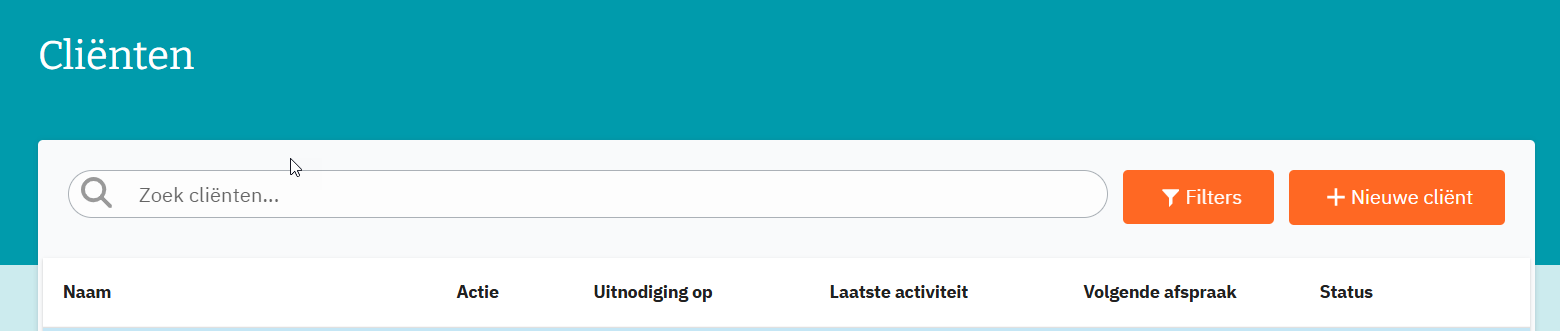 Het overzicht kan oplopend en aflopend gesorteerd worden op ‘Naam’, ‘Uitgenodigd op’ en ‘Laatste activiteit’, maar niet op ‘Volgende afspraak' of 'Status’.