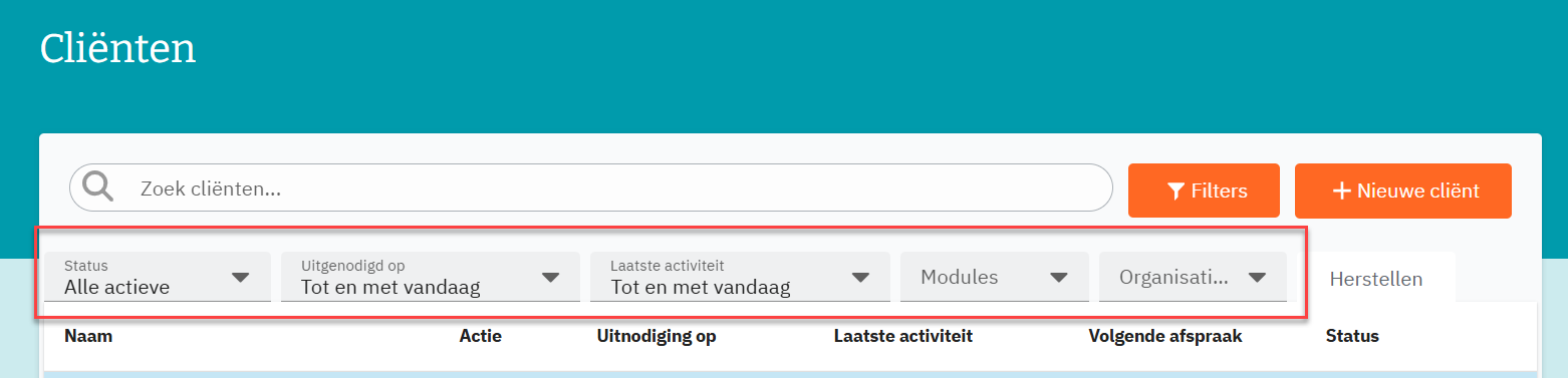 Hoe meer filters tegelijk worden gebruikt, hoe strenger de selectie, en hoe minder cliënten zullen worden getoond. Binnen ieder filter kan slechts één item worden geselecteerd.