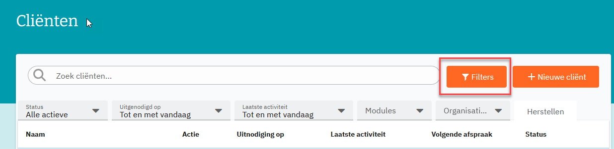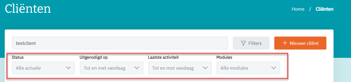 Hoe meer filters tegelijk worden gebruikt, hoe strenger de selectie, en hoe minder cliënten zullen worden getoond. Binnen ieder filter kan slechts één item worden geselecteerd.
