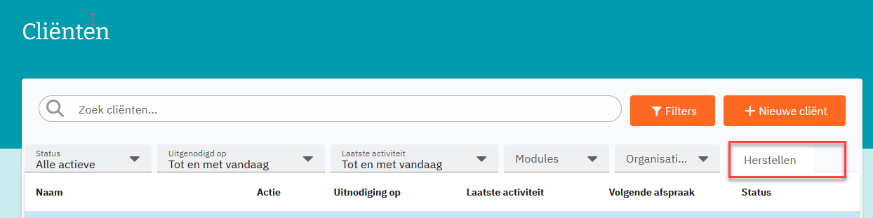 Het cliëntenoverzicht kent een aantal filters die het zoeken van een cliënt of groepen van cliënten vergemakkelijken. Maar een verkeerde instelling van deze filters kan een specifieke cliënt onzichtbaar maken.