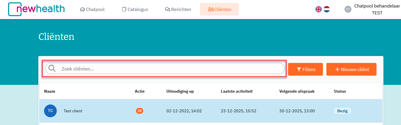 Maak gebruik van de zoekfunctie van het cliëntenoverzicht en klik op de naam van de cliënt:
