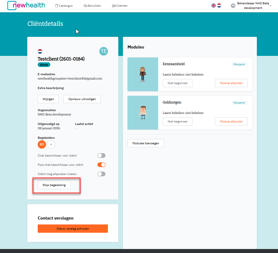 Ook ontvangt de cliënt een notificatiemail ‘Begeleiding gestopt op NewHealth Collective’.