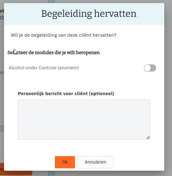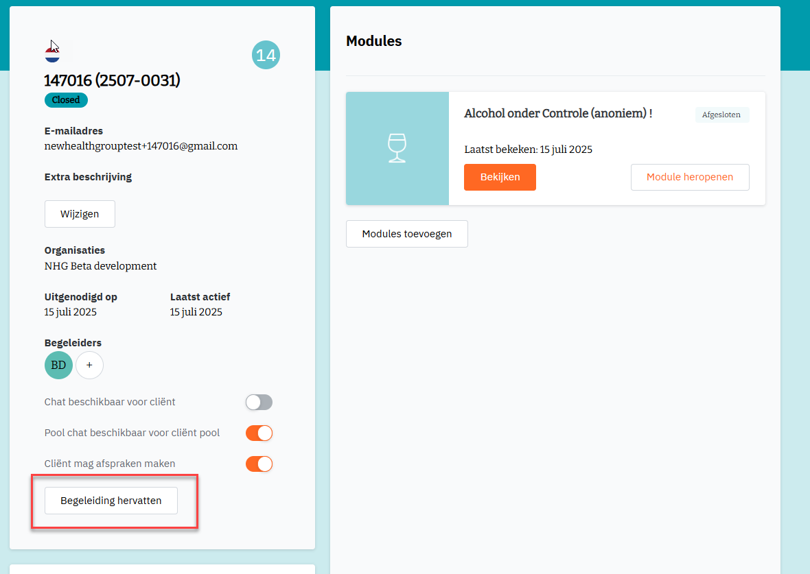 Je landt nu op de cliënt-detailpagina; klik linksonder ‘Begeleiding hervatten':